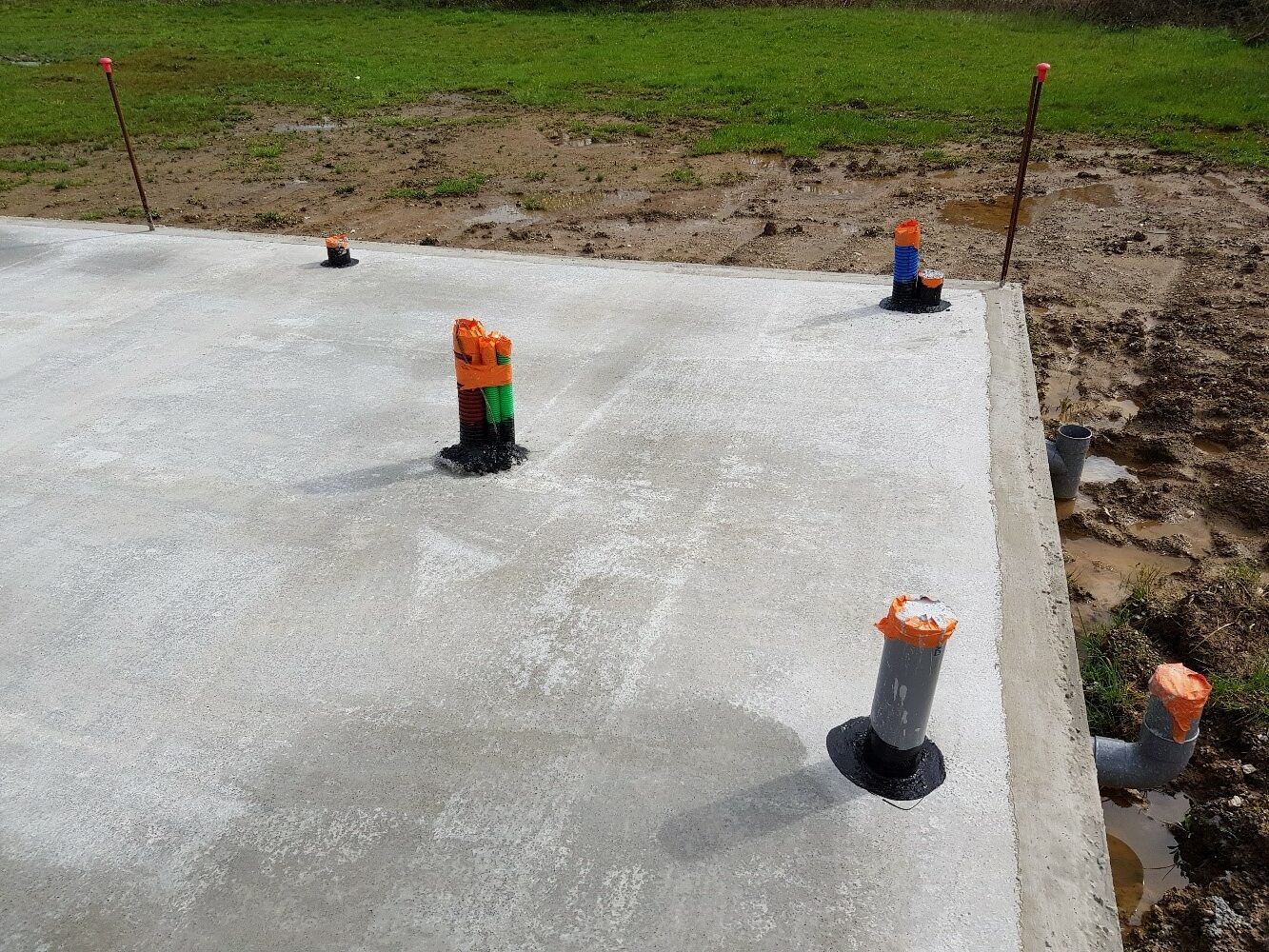 La pose de la barrière physico-chimique sous la totalité de l’assise du bâti (mise en œuvre dite surfacique) en insistant particulièrement au niveaux des points singuliers (passage de gaines, fourreaux, canalisation à travers la dalle).